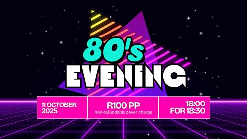 Early Bird ticket per person - 80s evening (Until 7 Oct '25) (38 avail) - R80.00