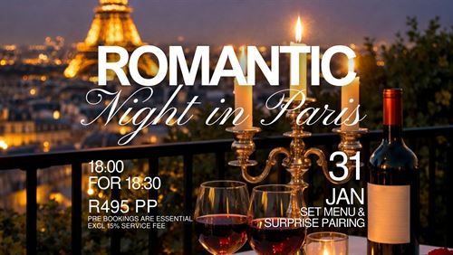 Early Bird ticket - Romantic night in Paris evening with surprise pairing (4 course) ticket PER PERSON (25 avail) - R450.00