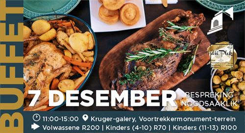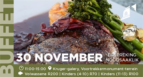 Gaste word vriendelik versoek om teen 12:00 hul plekke in te neem. Let daarop dat die buffet slegs op bespreking beskikbaar is.